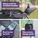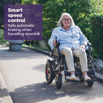 Steering is intuitive using the joystick that can be mounted on either the left or right-hand side, and with easy-to-read LED controls. You can travel along at a sensible speed of up to 6km/h, which is a brisk walking pace.