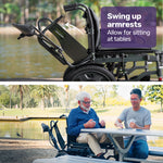 Getting on and off this Equipmed Power Wheelchair is easy thanks to swing-up armrests and the swing-up footrest. The retracting armrests also give you the option of dining at a table.