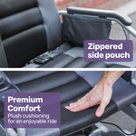 The 48cm-wide seat accommodates riders of various sizes, while memory foam cushioning on the seat, backrest, headrest, and calf supports ensures exceptional comfort. A robust front and rear suspension system absorbs bumps for a smoother ride.