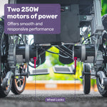 Equipped with twin 250-watt motors, this wheelchair ensures a smooth and responsive ride. It handles slopes and ramps up to a 13-degree incline with ease and offers a tight 1.1m turning radius, perfect for navigating paths, shopping centres, parks, and supermarkets.