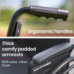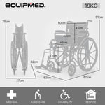 This Equipmed wheelchair features height-adjustable footrests that also swing out for easy access onto the wheelchair. Comfy padded armrests and a padded seat with generously proportioned backrest ensure a comfortable ride. The armrests have quick-release levers which allow them to swing back to allow for convenient access at tables when dining. And, thanks to the 2-second folding action and ergonomic handles, it makes for a relaxing day out for any helpers, too!