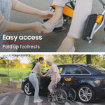• Storage:  Folds in seconds, Fold up Footrests, Backrest Storage Pouch