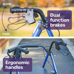 With dual-action braking and parking handbrakes, adjustable handle height, ridged grips, padded seating and a padded contoured backrest, your Equipmed rollator offers great ergonomics and comfort.