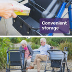 Under the seat is a waterproof storage compartment which offers plenty of space for books, blankets and groceries. Plus, there’s also a place on the side to conveniently clip on an umbrella or walking cane.