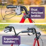 With dual-action braking and parking handbrakes, adjustable handle height, ridged grips, padded seating and a padded contoured backrest, your Equipmed rollator offers great ergonomics and comfort.