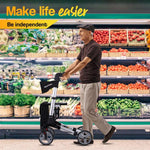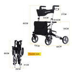 Venture outside on the large 8” rubber wheels which are designed to roll smoothly over the bumps inside and outside, and have reflectors for peace of mind. The comfortable seat with padded back rest comes in handy when you’ve found a pleasant spot to watch the world go by, or perhaps simply feel like a rest when waiting in line. Simply push the handles down and the walker is locked into place.