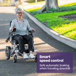 Twin motors offering a total of 500 watts offer an enjoyable riding experience with smooth and responsive performance, not to mention the ability to climb hills and ramps right up to a 15-degree incline! A tight 1m turning circle offers the manoeuvrability you need on paths and in places like shopping centres and airports.