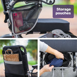 There are easily accessible mesh pockets under each armrest as well as a reading material pouch behind the backrest. Easily removable and machine washable seat and backrest cover for convenience.